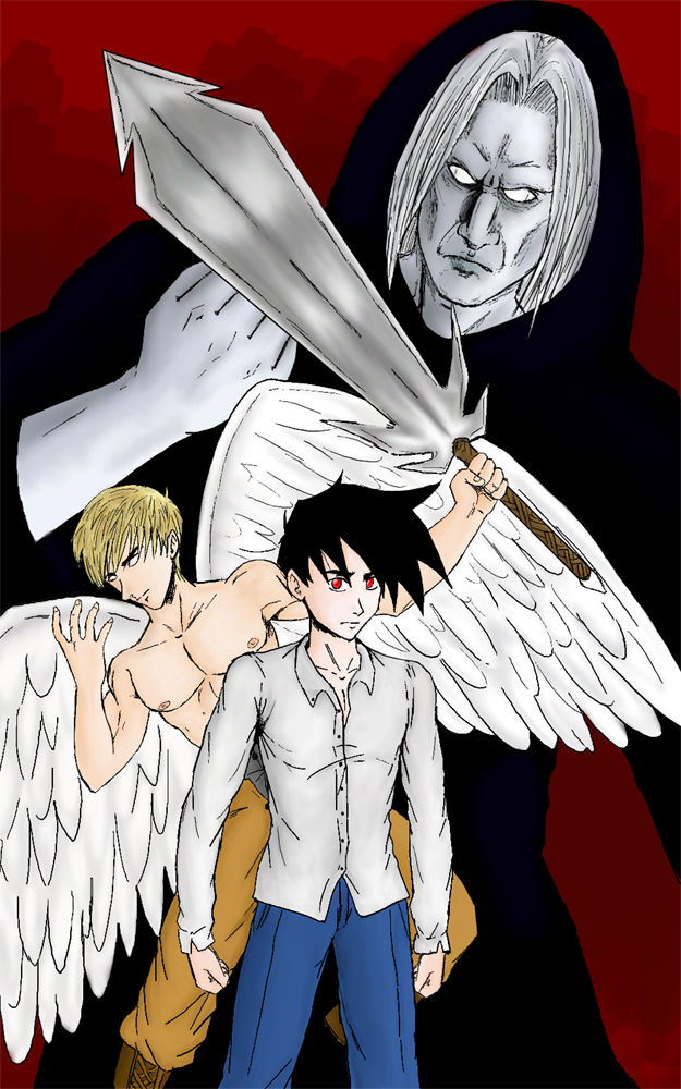 enfin si c le cas le contraste entre l'ange (le bien) et le gars en noir derriere (le mal bien sur ^^) rend trés bien ! =D
